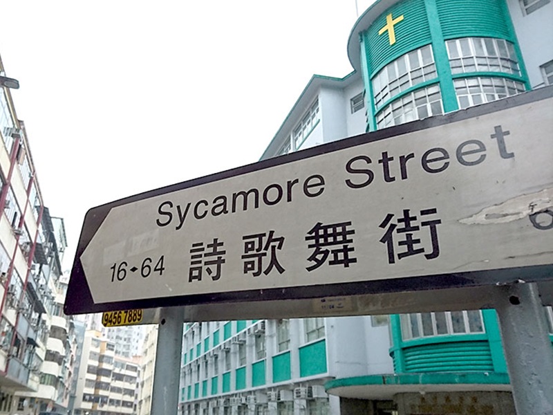 桑樹的英文是 sycamore,香港大角咀也有一條以桑樹命名的街道 Sycamore Street,即詩歌舞街。